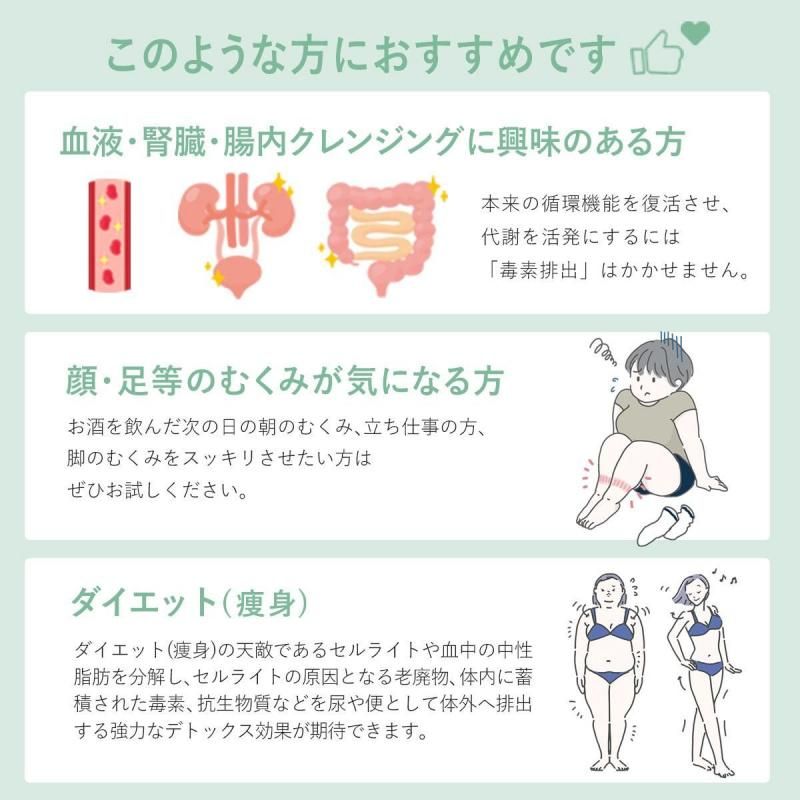 - 【3】ダイエット(痩身)・体質改善効果 セルライトや血中の中性脂肪を分解し、セルライトの原因となる老廃物、体内に蓄積された毒素、抗生物質などを尿や便として体外へ排出させるデトックス効果が期待できます。むくみ気味、便秘気味の方にもおすすめ。