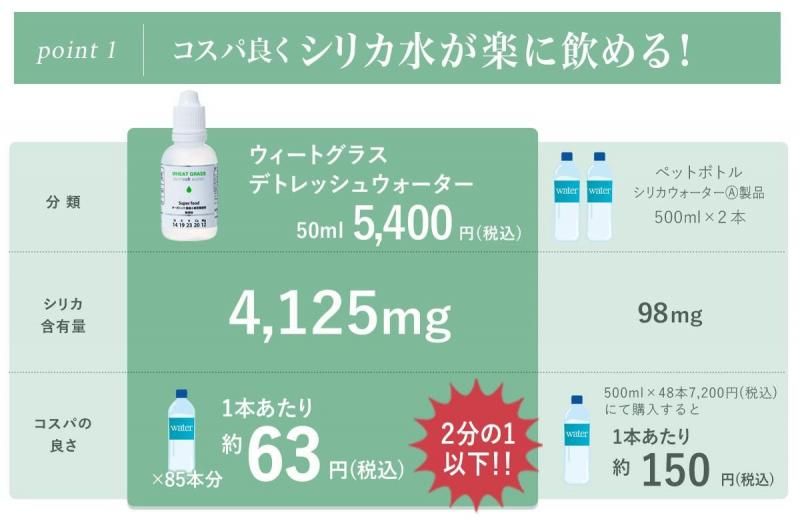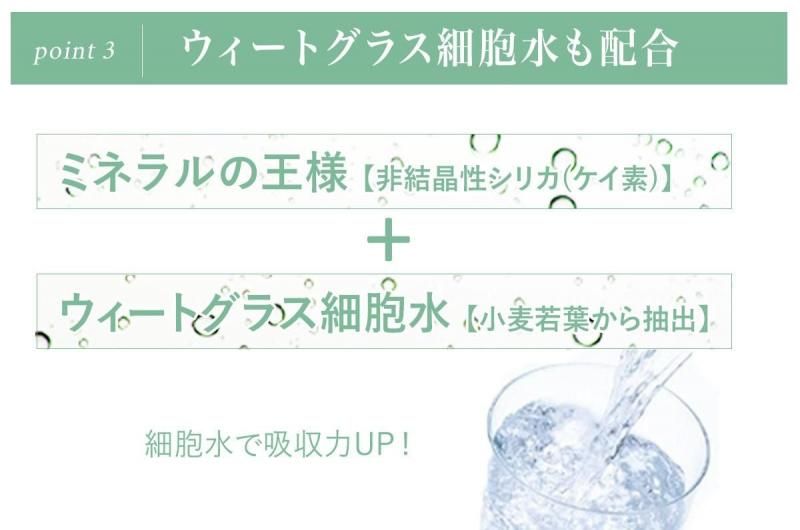 - 【ウィートグラス細胞水×ケイ素濃縮液】 30-40度の低温・真空で抽出することで本来の成分がほぼ100%原料に含まれるウィートグラス細胞水と水晶石を2000度以上で燃焼させて溶解させた活性ミネラル濃縮液(ケイ素)を採用。水の分子が小さく吸収性・浸透性に優れているのが特長。