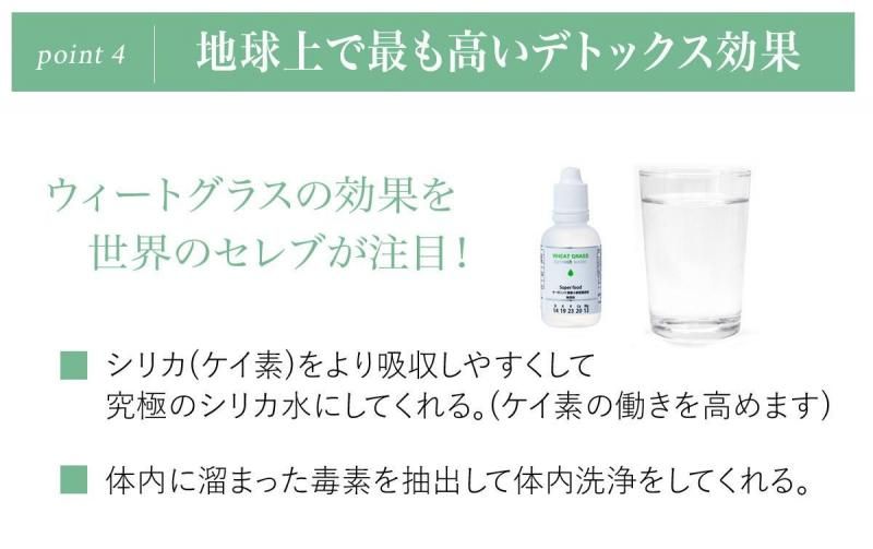 - 【ウィートグラスとは】 いわゆる小麦若葉。栄養素の70%はクロロフィルという緑色の植物色素で、抗酸化作用や鉄分を含み、健康効果が期待されています。ビタミンA、C、E、B類が豊富。それ以外にも土壌に含まれているミネラル成分の92種類のうち、82種類もの栄養素が詰まっていて、血液中のコレステロール値の改善、善玉菌を増やしての整腸作用や、鉄分の補給やターンオーバー促進、抗酸化によるエイジングケア効果が期待できるスーパーフード。さらにカタラーゼ酵素が豊富で白髪予防にも。「グルタチオン」という高タンパク質も含まれている栄養素のかなり高い植物です。